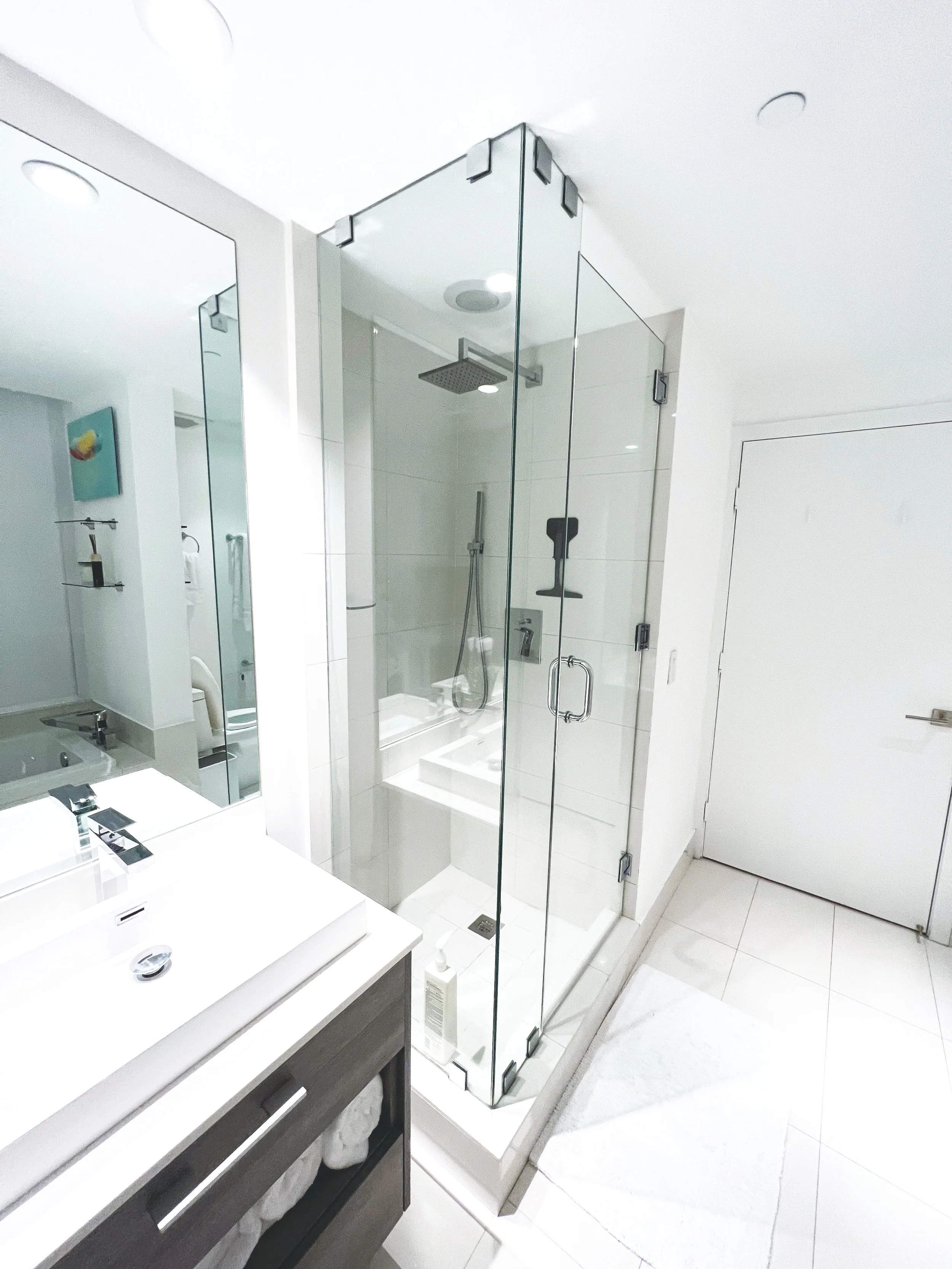 Open Master suite with bathroom that feature European-designed cabinetry amid imported stone vanity tops with mirrors and imported, porcelain flooring.